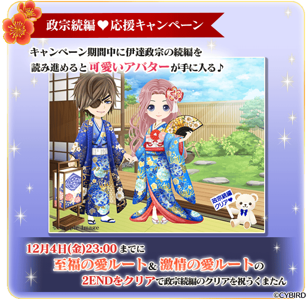 配信を記念して「政宗続編♡応援キャンペーン」を、本日10月23日(金)から、12月4日(金)23時まで開催いたします。期日までに条件をクリアすると「政宗続編のクリアを祝うくまたん」アバターをプレゼントいたします。