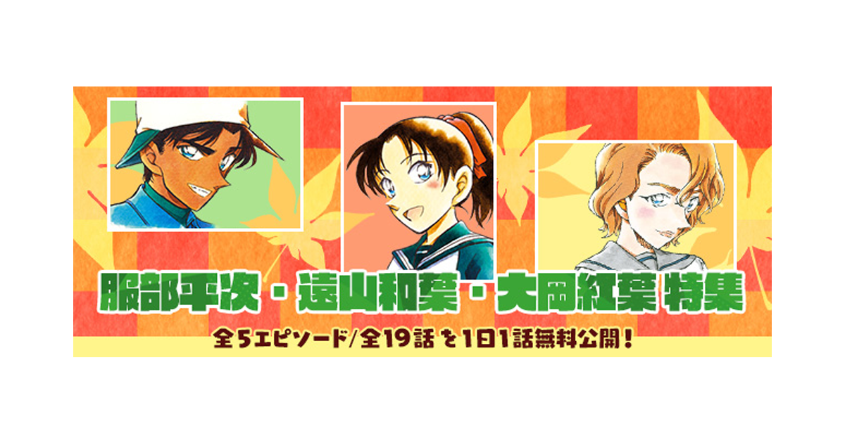 本特集では、「服部平次」「遠山和葉」「大岡紅葉」が登場するエピソードをまとめた特集を実施します。「名探偵コナン公式アプリ」内にて、全5エピソード19話を、1日1話無料でお読みいただけます。プレミアムクラブ会員の方は、公開された話は期間中いつでも無料購読できます。会員ではない方も期間中、第90・91巻の「コナンと平次の鵺伝説」と各エピソードの1話目は、公開後いつでも無料購読できます。