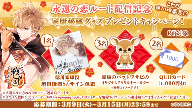 「徳川家康」「永遠の恋」ルートの配信を記念して、『イケメン戦国◆時をかける恋』公式Twitterにて、「\これが徳川埋蔵金⁉/家康秘蔵グッズプレゼントキャンペーン!」を開催します。参加方法は、アカウントをフォロー&該当のツイートをRTするだけ。抽選で6名様に、「徳川家康」のCVを務める増田 俊樹さんのイラスト入りサイン色紙や、「徳川家康」のペット「ワサビ」のオリジナルアクリルキーホルダーなど、「徳川家康」に関する秘蔵グッズやクオカードをプレゼントします。ぜひ奮ってご参加ください!