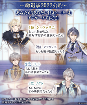 2022年6月開催の総選挙で上位4位までに輝いた「シュヴァリエ=ミシェーレ(CV:小野 友樹)」、「クラヴィス=ルルーシュ(CV:野島 健児)」、「リヒト=クライン(CV:大海 将一郎)」、「ノクト=クライン(CV:江口 拓也)」の全4ルートのイベントになっており、お客様アンケートで決定した「あなたが読みたいifストーリー」をお楽しみいただけます。