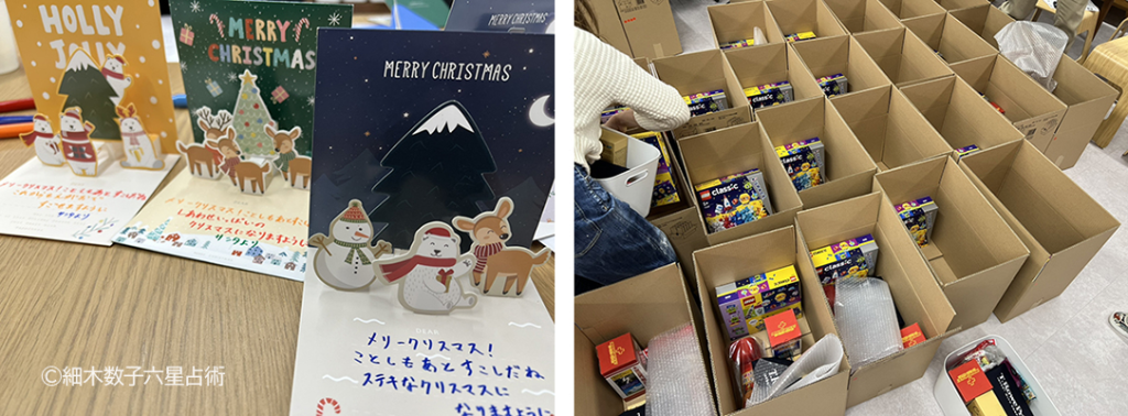 2024年12月、認定NPO法人フローレンスが企画した、「クリスマスぬくもり便」キャンペーンにて、クリスマスプレゼントを梱包するボランティアに、細木 かおりと応募で募った方とで参加しました。