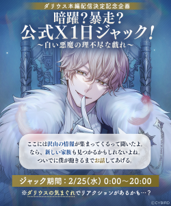 さらに、『イケメンヴィラン』公式X(https://x.com/Ikemen_Villains)では、ダリウスが公式Xをジャックする、「ダリウス本編配信決定記念企画 暗躍?暴走?公式X1日ジャック!~白い悪魔の理不尽な戯れ~」の実施が決定しました。