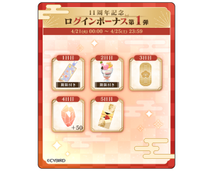 『イケメン戦国 -永縁-』のアプリ内では、4月21日(火)0時00分より、11周年を記念したログインボーナスの第1弾「11周年記念◆ログインボーナス第1弾」を開催します。