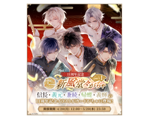 『イケメン戦国 -永縁-』のアプリ内では、4月20日(月)12時00分より、11周年記念イラストを使用したカードガチャ「11周年記念◆新風堂々がちゃ part1」を開催します。