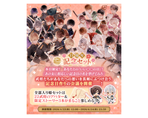『イケメン戦国 -永縁-』のアプリ内では、4月22日(水)12時00分より、限定ストーリーやアバターに加え、アイテムをお得に購入できる「11周年記念セット」を販売します。