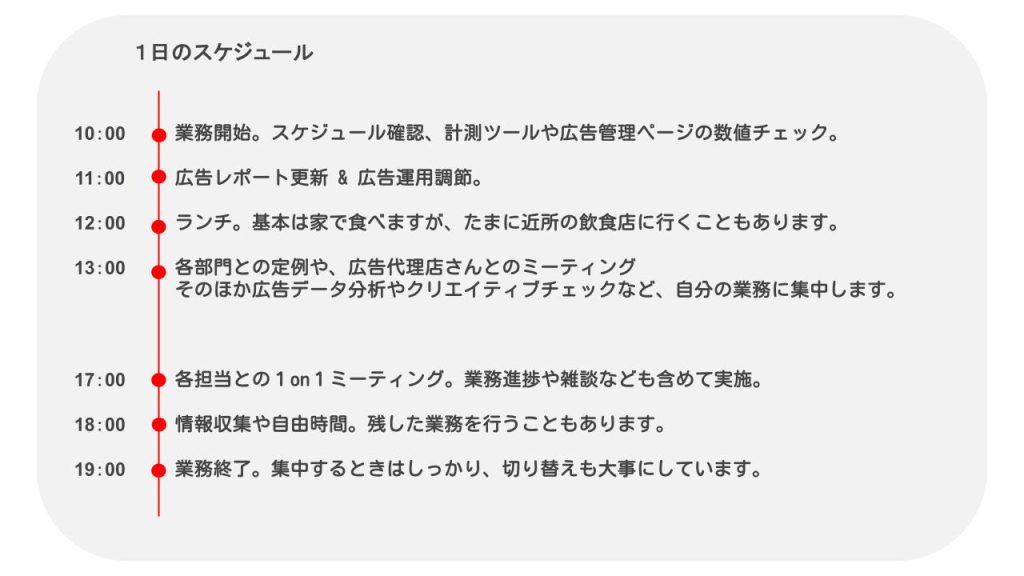 その中で私は、部長として部署全体を管理しながら、専門領域であるデジタル広告の戦略立案・予算管理・運用管理を担当しています。
